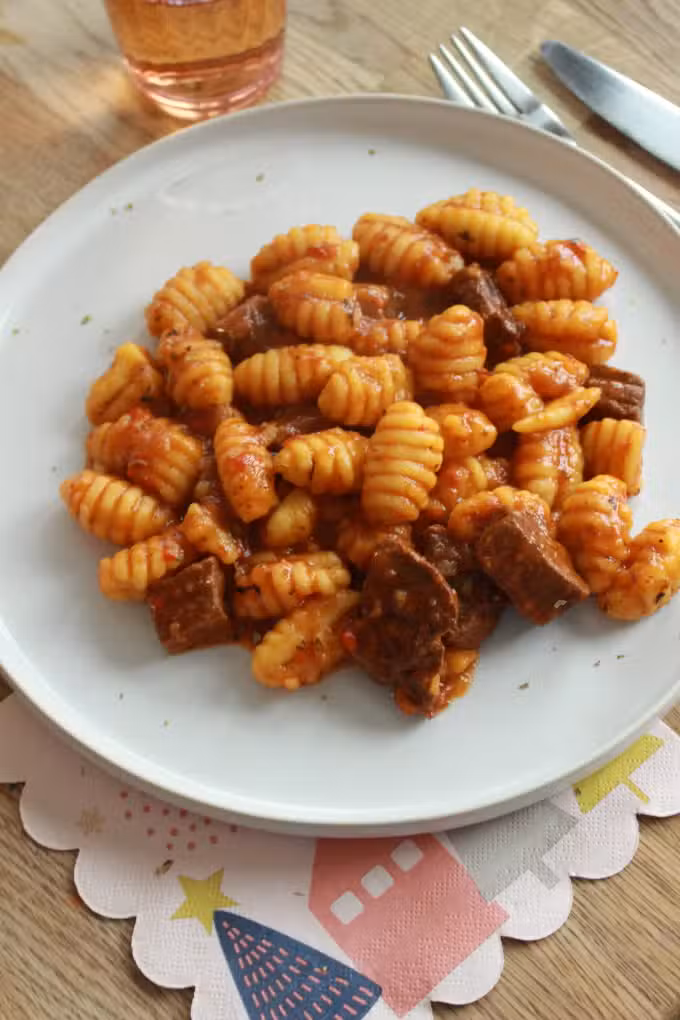 Auf der wöchentlichen Suche nach neuen Ideen für unseren Familientisch bin ich auf das Rezept für diesen Gulasch-Gnocchi-Topf gestoßen (das Originalrezept hab ich euch verlinkt). Das klang perfekt zu uns und passte mit der etwas längeren Kochzeit auch zu meinem kurzen Schultag. Gulasch wäre sonst nicht so typische Gericht für unter der Woche bei uns, da mir dafür mittags die Zeit fehlt.