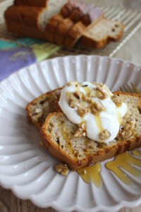 Bananenbrot in Scheiben schneiden und mit griechischem Joghurt, Honig und Walnusskernen genießen